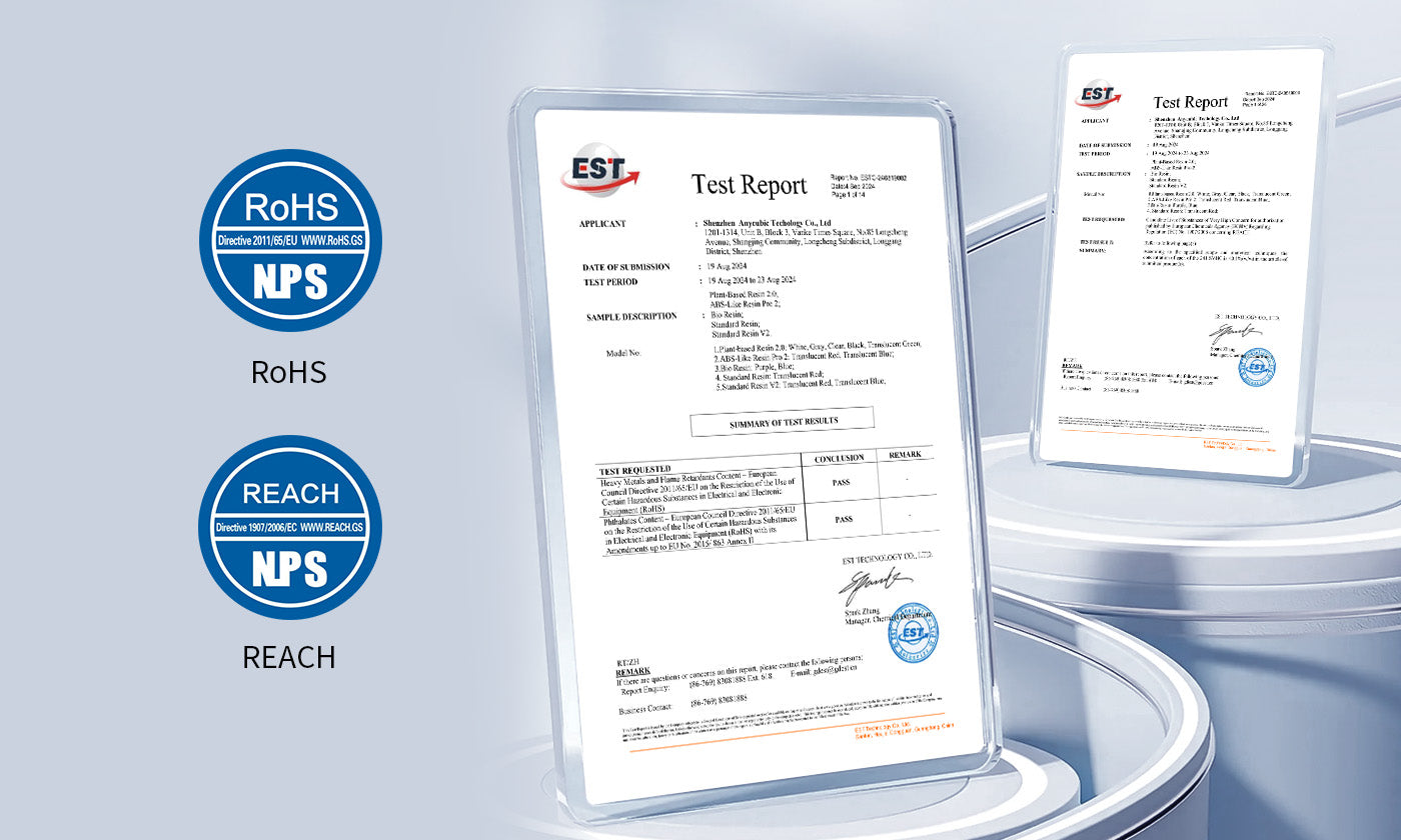 Anycubic Plant-Based UV Resin 2.0 is derived primarily from soybeans, delivering a low-odor printing experience. Certified compliant with RoHS and REACH standards, it ensures greater safety and peace of mind during use.